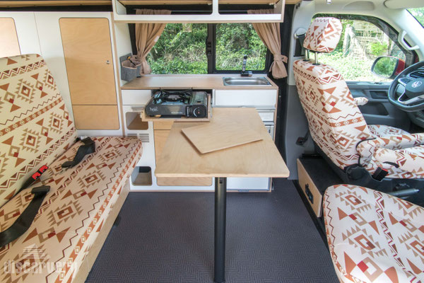 Die Möbelzeile ist so gestaltet dass auch der Fahrersitz gedreht werden kann, und so eine großzügige Sitzgruppe entsteht. Der schwenkbare Innenraumtisch kann an verschiedenen Positionen im Wohnraum genutzt werden. Schwenkst du den Tisch nach draußen, wird daraus ein wunderbarer Stehtisch zum Abstellen von Getränken oder ein Outdoorkochplatz auf deiner "Terrasse". Mit einem passenden Sonnensegel oder einer Markise erweiterst du so deinen "Wohnraum" um einige Quadratmeter.