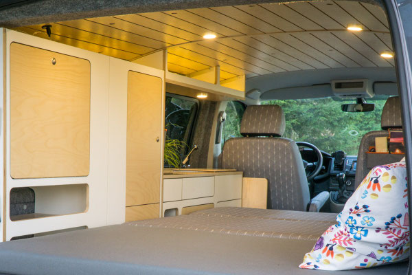 - Das ist aber im VanBUS kein Problem. Für eure Kleidung, Küchenutensilien und persönlichen Dinge habt ihr in den Schränken reichlich Platz, den ihr Dank der zahlreichen und großen Türen und Klappen auch vollständig nutzen könnt.