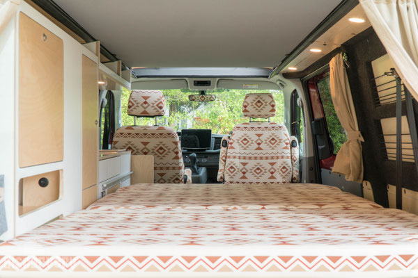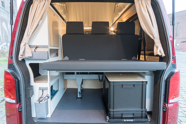 Mit wenigen Handgriffen ist die Schlafsitzbank im VanBUS zu einem gemütlichen Bett mit einer ca. 190 cm langen und 130 cm breiten Liegefläche umgebaut.