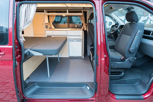 Bei gebautem Bett bleibt der Kühlschrank noch voll zugängig; praktisch, wenn du dein Bett schon für die Nacht vorbereitet hast, aber den Abend über noch kühle Getränke aus dem Bus holen möchtest.