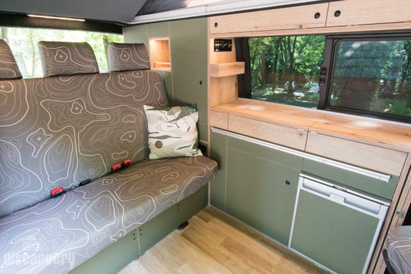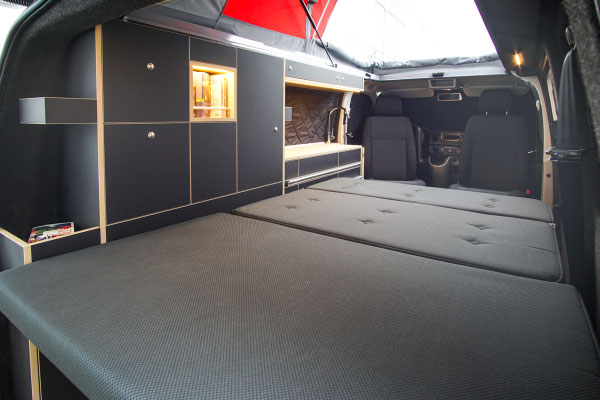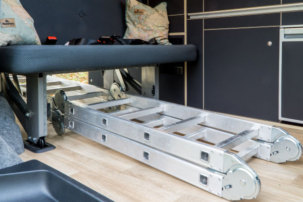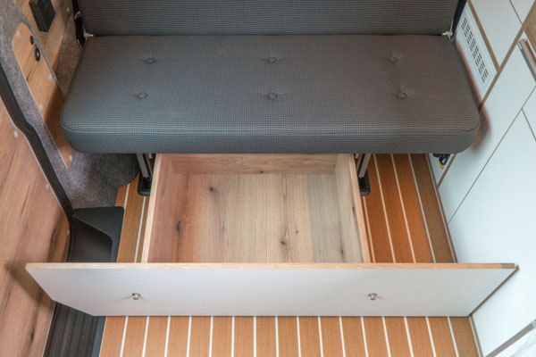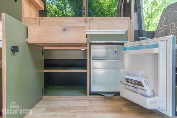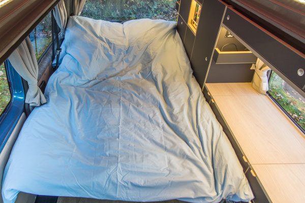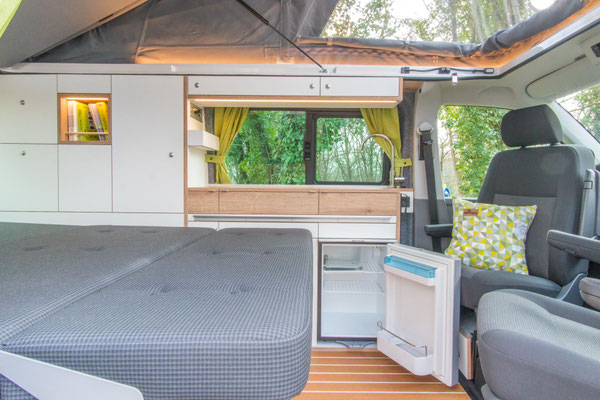 Bei gebautem Bett bleibt der Kühlschrank noch voll zugängig; praktisch, wenn du dein Bett schon für die Nacht vorbereitet hast, aber den Abend über noch kühle Getränke aus dem Bus holen möchtest.