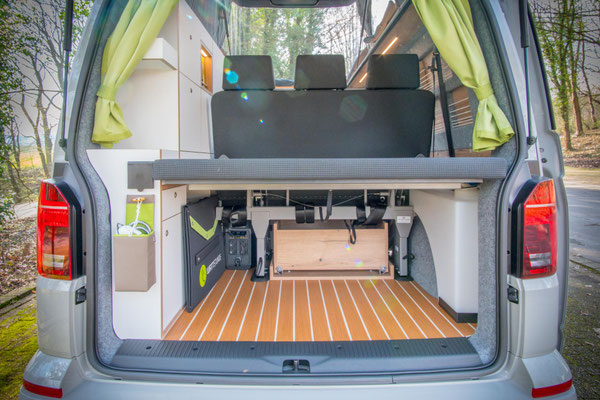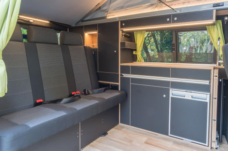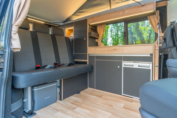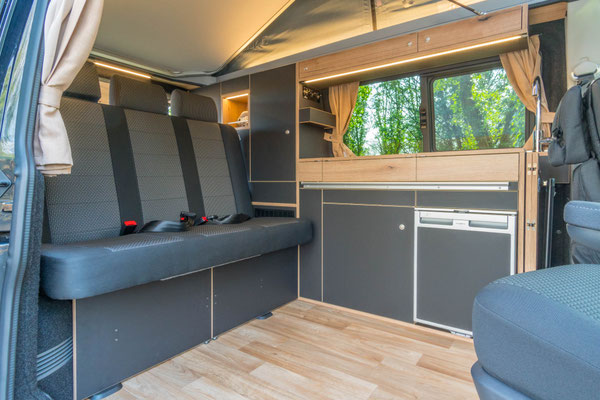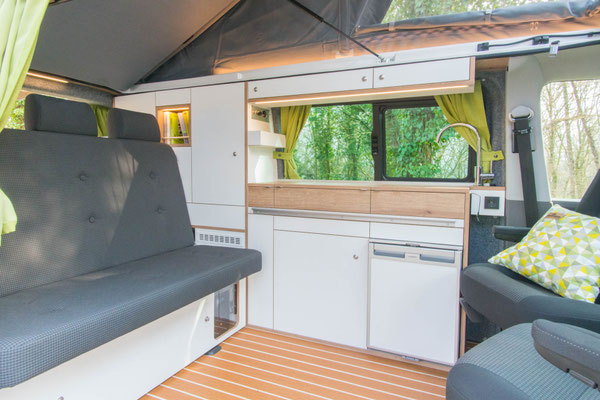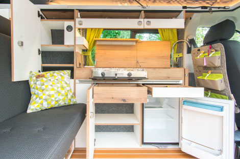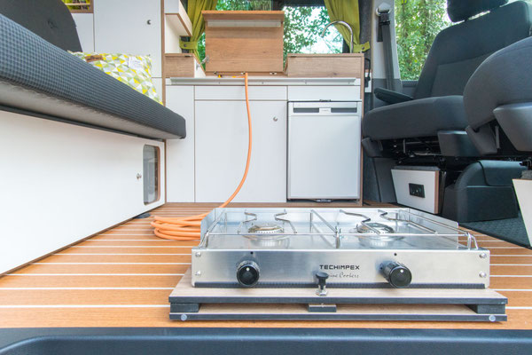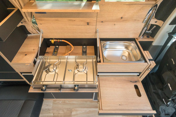 Die kompakte Küche im WohnBUS bietet nicht nur reichlich Stauraum für Töpfe, Geschirr und Besteck, sondern auch einen 40 Liter fassenden Kompressorkühlschrank, eine Spüle und eine Kochstelle. Dabei kannst du selber entscheiden ob dir ein ein-flammiger Kartuschenkocher reicht (Serie), oder ob du gerne einen zwei-flammen Kocher mit fester Gasversorgung und 5 kg Gasvorrat haben möchtest. Sowohl Spüle als auch die Kocher verschwinden bei Nichtgebrauch unter jeweils einer Klappe. So entsteht eine große, plane Ablagefläche im Wohn- und Küchenbereich. Die Klappen dienen gleichzeitig als Spritzschutz.