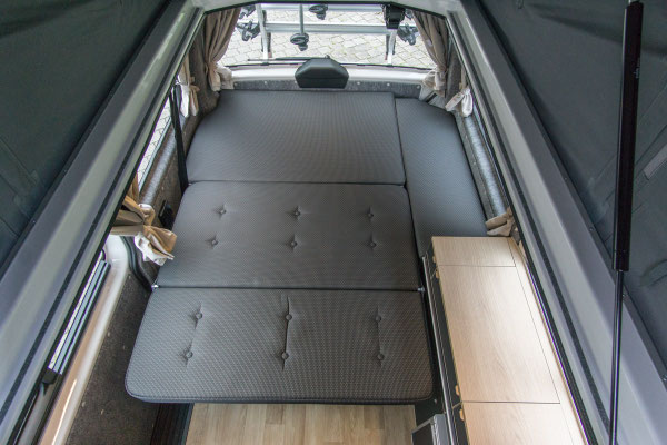 Benötigst du mehr als zwei Schlafplätze oder möchtest die Sitzgruppe zum Schlafen nicht umbauen, dann schafft ein optionales Aufstelldach zwei weitere Schlafplätze im ersten Obergeschoss.